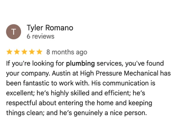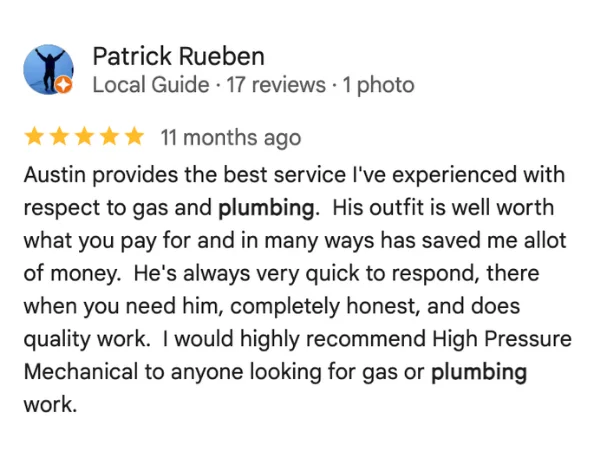 At High Pressure Mechanical, we offer fast, same-day plumbing repair services across the greater Vancouver area with service you can trust. Our fully licensed and insured technicians are backed by $3Million in liability coverage. With upfront, flat-rate pricing and over 90+ five-star google reviews, we’re proud to be a family-owned business that puts customers first. For reliable, affordable plumbing service, call High Pressure Mechanical today.